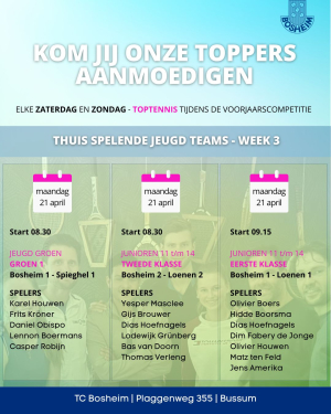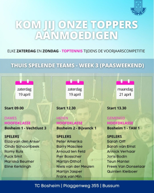 Kom jij onze toppers aanmoedigen? (1/1) Title Kom jij de Bosheim teams aanmoedigen tijdens de voorjaarscompetitie? Iedere zaterdag en zondag (of maandag - 2de paasdag) gegarandeerd toptennis wedstrijden. Daarvoor hoef je niet naar Wimbledon of Roland Garros! Nieuws Overzicht