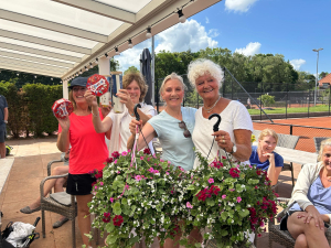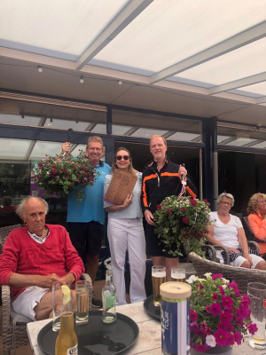 Na afloop van de wedstrijden bleef het nog lang gezellig op het terras. Onder het genot van een drankje werd er nagepraat, gelachen en genoten van het mooie weer. Het toernooi werd afgesloten met een prijsuitreiking. Bij de heren gingen Akko en Theo er met de eerste prijs - een kleurrijke zomerplant - vandoor. De nummers twee, Duco en Fred, werden verrast met lekkere chocolade. Bij de dames werd er een heuse finale gespeeld tussen de winnaars van de twee poules; het gelegenheidsduo Jacqueline en Louky trok in een supertiebreak aan het langste eind. Ook voor hen natuurlijk de mooie hangplant, Josje en Lidie werden tweede.