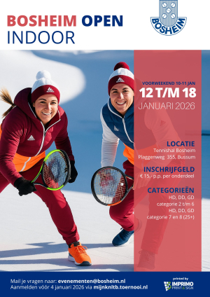 Het Bosheim Dubbel Open Indoor toernooi wordt gespeeld op onze binnenbanen van maandag 12 t/m zondag 18 januari 2026 (voorweekend 10 en 11 januari 2026). Wil je het jaar sportief en competitief beginnen, doe dan mee! Aanmelden vóór 4 januari 2026 via mijnknltb.nl